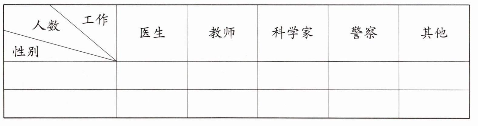 本题需要通过实际调查本班同学长大后最希望从事的工作情况,分别统计出不同性别同学对于医生、教师、科学家、警察、其他这几种工作的期望人数,然后将相应数据填入表格。