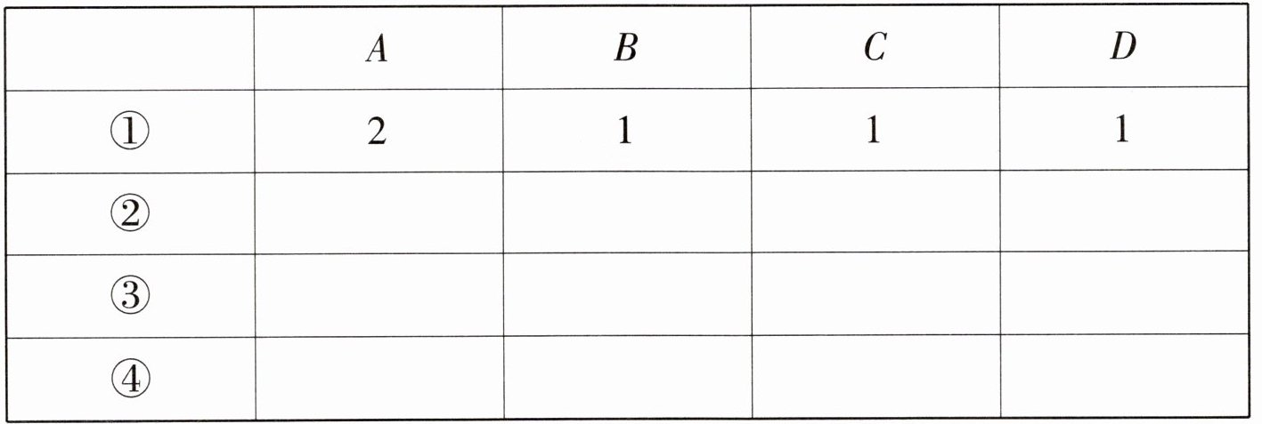 二、把5块蛋糕分给A、B、C、D4个小朋友,每人至少分一块。有多少种分法?请用列表法解答。