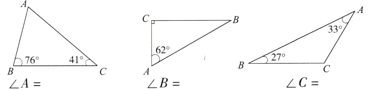 $\angle A = 63^{\circ}$ $\angle B = 28^{\circ}$ $\angle C = 120^{\circ}$