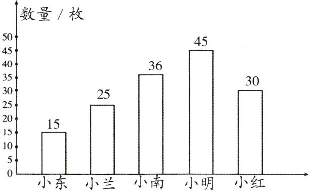 小东收集邮票15枚,小兰收集邮票25枚,小南收集邮票36枚,小明收集邮票45枚,小红收集邮票30枚。