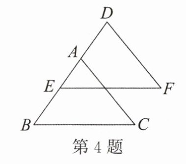4. 如图,将$\triangle ABC$沿$BA$方向平移,得到$\triangle DEF$。若$BD = 8$,$DE = 5$,则$AE$的长为(