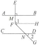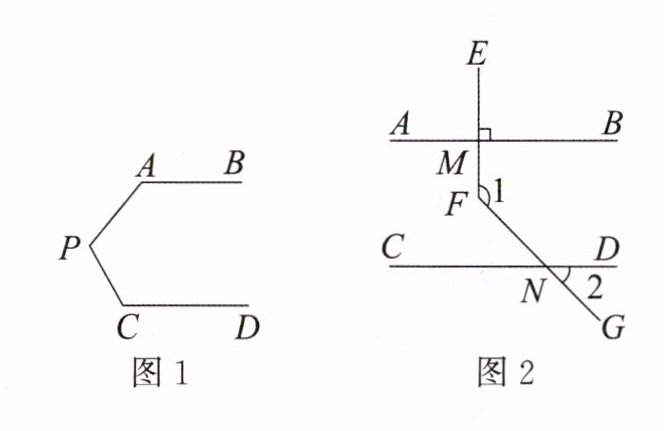 (2)如图2,已知:$AB// CD$,$EF\perp AB$于点$M$,$FG$交$CD$于点$N$。若$\angle 1 = 135^{\circ}$,则$\angle 2$的度数为多少?