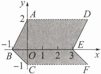 15. 如图,在平面直角坐标系 $ xOy $ 中,将折线 $ ABC $ 向右平移得到折线 $ DEF $,则折线 $ ABC $ 在平移过程中扫过的面积是______