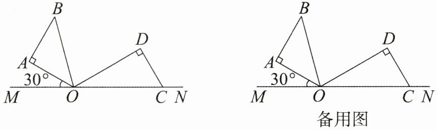 已知一副直角三角板先按图中的方式拼接在一起,其中$OC$与直线$MN$重合,$∠AOM=∠COD=30^{\circ}$,$∠AOB=45^{\circ}$.