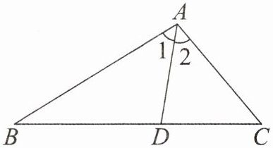 解析:AD是△ABC的角平分线,则AD平分∠BAC,∠1 = ∠2 = $\frac{1}{2}$∠BAC,且点D在边BC上。