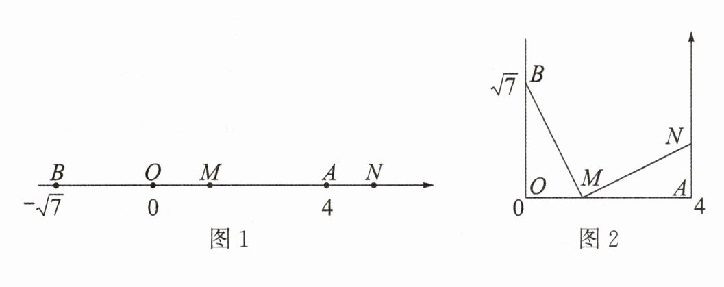 10. 如图1,数轴上从左至右依次有$B$,$O$,$M$,$A$,$N$五个点,其中点$B$,$O$,$A$表示的数分别为$-\sqrt{7}$,$0$,$4$. 如图2,将数轴在点$O$的左侧部分绕点$O$顺时针方向旋转$90^{\circ}$,将数轴在点$A$的右侧部分绕点$A$逆时针方向旋转$90^{\circ}$,连接$BM$,$MN$. 若$\triangle OBM$和$\triangle AMN$全等,求点$M$表示的数.