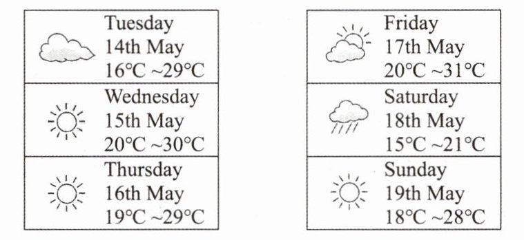)25. According to the weather report, the highest temperature of this week will be on ______.A. Sunday B. Saturday C. Friday D. Thursday