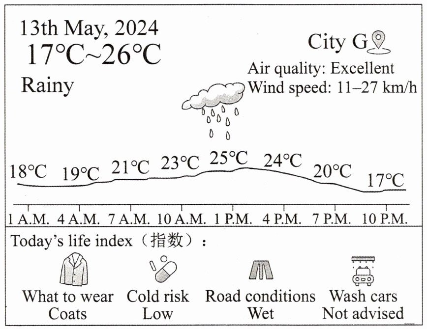 )23. Henry is in City G today. What will most probably happen to him according to the graphics?A. He will wash his car. B. He will catch a cold.