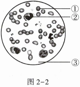 3. 小明在打篮球时突然受伤晕倒,送往医院处理伤口并进行血样检测,发现其晕倒原因是贫血。图2-2是显微镜下的人血涂片。下列有关说法正确的是(