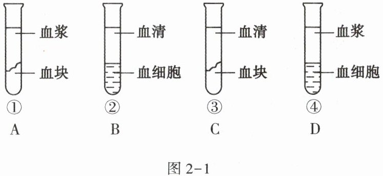 1. 如图2-1所示,将等量的鸡血分别注入4支试管中,其中①②试管中不加任何物质,③④试管中加入抗凝剂并轻轻摇动几次。静置一段时间后,可观察到的现象是(