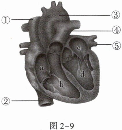 7. (2024·菏泽)图2-9为心脏结构示意图,a~d表示心脏四腔,①~⑤表示血管。下列说法错误的是(