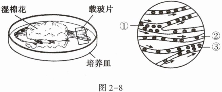 5. 小明同学在低倍物镜下观察小鱼尾鳍内的血管及血液流动情况(图2-8),以下解释不合理的是(