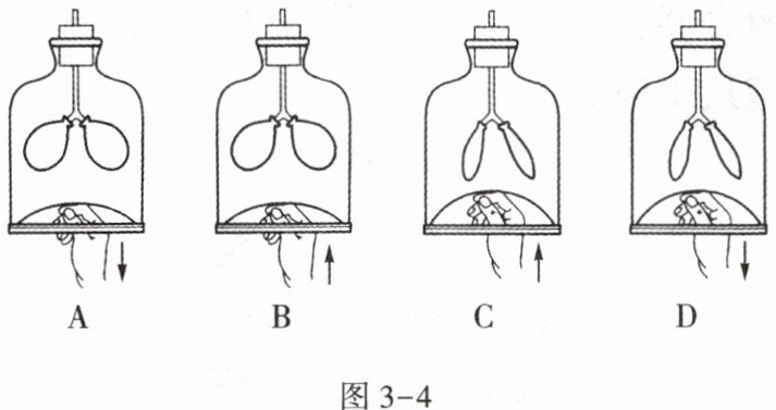 7. (2024·齐齐哈尔)兴趣小组的同学利用模拟膈肌运动的装置探究呼吸运动,图3-4中能正确展示呼气时肺和膈肌状态的是 (