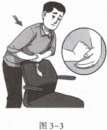 6. 当异物堵塞呼吸道,导致呼吸困难时,我们可以一手握拳,靠椅背上抵紧腹部,快速有力地反复推挤(图3-3)。下列叙述错误的是 (