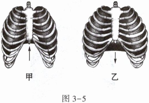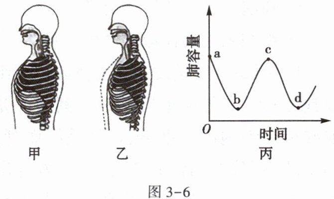 10. (2024·滨州)图3-6甲、乙表示人体呼吸时的不同状态,图丙是肺容量随时间的变化曲线。下列叙述正确的是 (