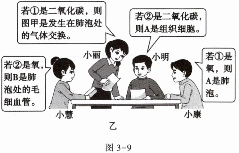 13. 图3-9甲是发生在人体肺部或组织细胞处的气体交换过程示意图,其中A是肺泡或组织细胞的一部分,B是毛细血管,①和②是不同的气体,箭头表示气体进出方向。图3-9乙中四位同学关于图甲的分析,正确的是 (