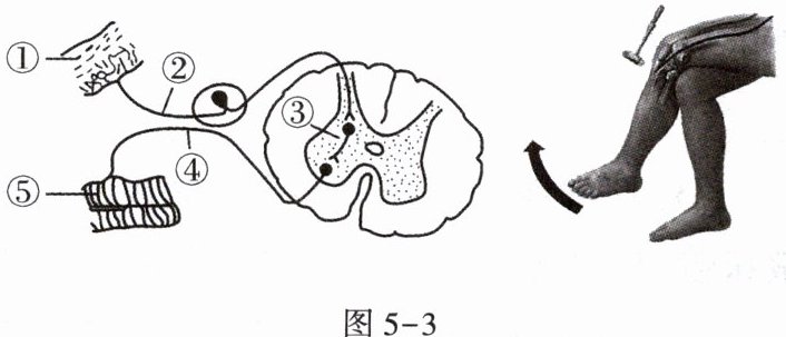 5. 如图5-3所示,当迅速叩击一下膝盖下的韧带,小腿会以膝盖为轴,突然地跳起来。对于小腿的这种反应,下列相关叙述不正确的是(