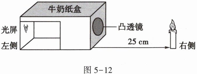 8. 生物学社团的同学们制作了一个模拟人眼球成像过程的简易装置,如图5-12。在距纸盒右侧圆孔25cm处点燃一根蜡烛,可以观察到光屏上出现一个物像。