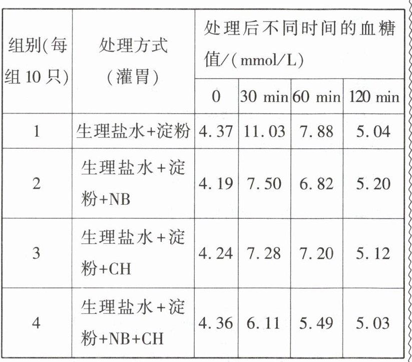 11.(2024·菏泽)阿卡波糖是口服降糖药,可有效降低餐后血糖高峰。为开发具有我国自主知识产权的同类型新药,科研人员研究了植物来源的两种药品生物碱(NB)和黄酮(CH)对餐后血糖高峰的影响。为此,利用生理状况相同的若干小鼠和有关试剂进行实验,将等量且适量溶于生理盐水的物质同时灌胃(用灌胃器将溶液由口直接注入胃中)各组小鼠后,在不同时间检测其血糖值,实验设计及结果如下表所示。请据表回答下列问题。
