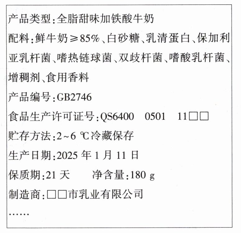 等信息。(2)该酸奶中的钙、铁属于无机盐类营养物质,可促进青少年正常的生长发育。如果儿童时期体内缺钙,易患