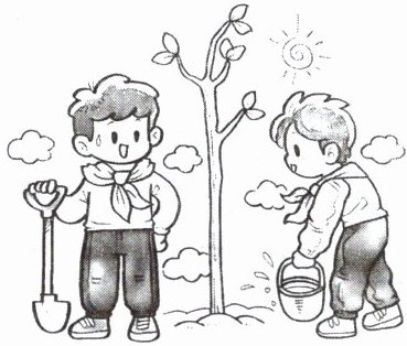 示例:春天到了,桐桐和龙龙一起来到郊外种树。桐桐用手扶住小树苗,龙龙用铲子铲土把树根埋起来,桐桐又给小树浇了水。他们干得真起劲儿!