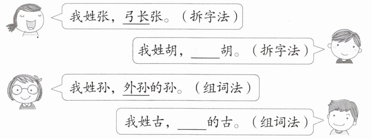 。3. 同行的小伙伴正在介绍自己的姓氏,请你照样子也说一说。