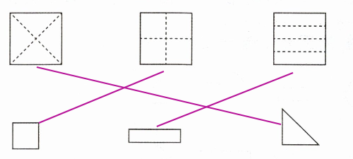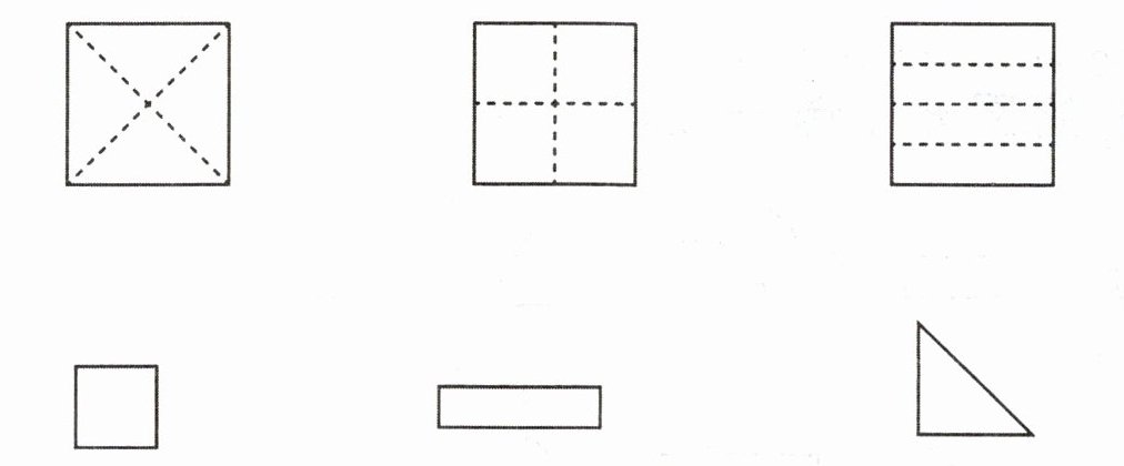 1. 将下面的正方形沿虚线对折,折出来的是什么图形?连一连。