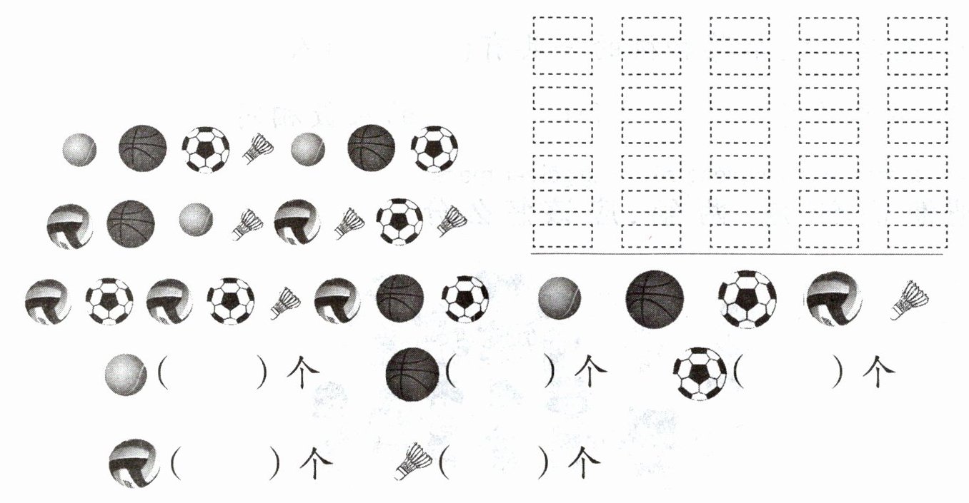 三、为贯彻落实党的二十大关于发展素质教育的精神,某校设立了课后体育兴趣班。下面是某班学生拥有的球的种类和数量。请你按种类先分一分,再涂一涂、填一填。