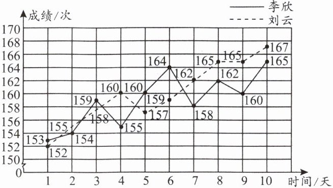 2. 李欣和刘云为了参加学校运动会1分钟跳绳比赛,提前10天进行训练,每天测试成绩如下面的统计图。