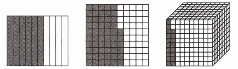 一、分别用小数和分数表示下面每个图中涂色部分的大小。