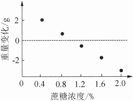 5. 将大小相同的萝卜条放在不同浓度的蔗糖溶液中,数小时后取出称其重量,增减的重量与蔗糖溶液的浓度关系如下图。下列说法不正确的是(