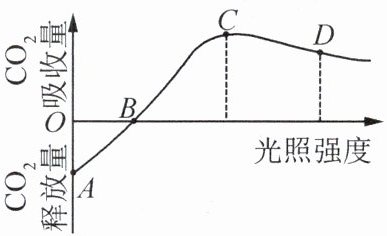 5. 将一株天竺葵置于黑暗环境中一昼夜,然后移至光下。如图为随光照强度的增强,天竺葵 $ CO_2 $ 吸收(释放)量的变化曲线图。据图分析错误的是 (