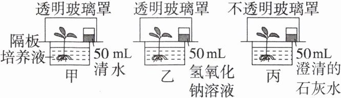 9. 某生物兴趣小组的同学为了探究植物的生理作用,设计了下面的三组装置(植物、培养液、隔板、光照等条件都相同,氢氧化钠溶液能吸收二氧化碳)。请回答下列问题: