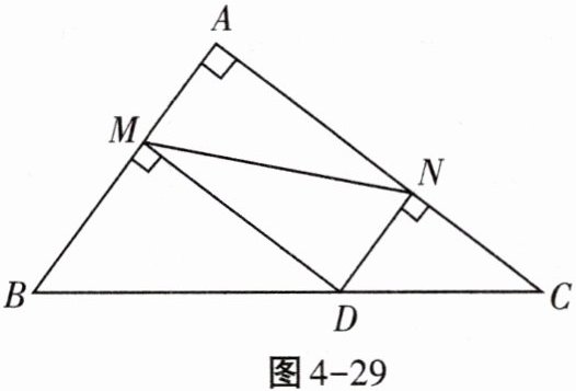 13. 如图4-29,在Rt△ABC中,∠BAC= 90°,且BA= 3,AC= 4,点D是斜边BC上的一个动点,过点D分别作DM⊥AB于点M,DN⊥AC于点N,连接MN,则线段MN的最小值为
