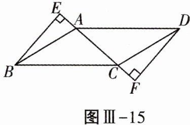 17. (6分)如图Ⅲ-15,在$□ ABCD$中,$BE⊥AC$,垂足为E,点E在CA的延长线上,$DF⊥AC$,垂足为F,点F在AC的延长线上,求证:$AE= CF$.