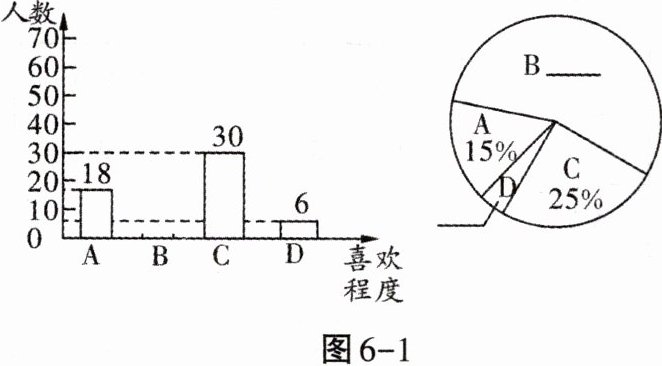 9. 某校为了进一步改变七年级数学教学,提高学生学习数学的兴趣,校教务处在七年级所有班级中,每班随机抽取了6名学生,并对他们的数学学习情况进行了问卷调查. 我们从所调查的题目中,特别把学生对数学学习喜欢程度的回答(喜欢程度分为:“A. 非常喜欢”“B. 比较喜欢”“C. 不太喜欢”“D. 很不喜欢”,针对这个题目,问卷时要求每名被调查的学生必须从中选一项且只能选一项)结果进行了统计,现将统计结果绘制成如图6-1所示的两幅不完整的统计图.