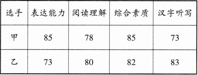 (2)如果表达能力、阅读理解、综合素质和汉字听写分别赋予它们2,1,3和4的权,请分别计算两名选手的平均成绩,从他们的这一成绩看,应选派谁?甲的平均成绩为