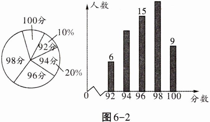 4. 某单位若干名职工参加普法知识竞赛,将成绩制成如图6-2所示的扇形统计图和条形统计图,根据图中提供的信息,这些职工成绩的中位数是