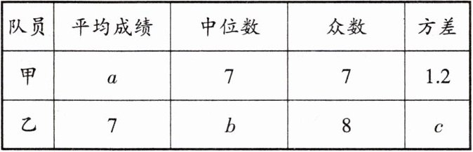 (2)从平均成绩看,甲、乙二人的成绩相等,均为7环;从中位数看,甲射中7环以上的次数小于乙;从众数看,甲射中7环的次数最多;而乙射中8环的次数最多;从方差看甲的成绩比乙的成绩稳定.综合以上各因素,若选派一名队员参加比赛,可选择乙参赛,因为乙获得高分的可能更大.