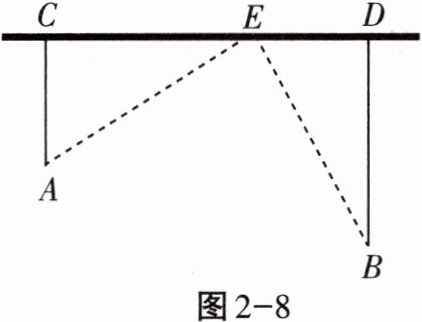 13. 如图2-8所示,在笔直的高速路旁边有$A$,$B$两个村庄,$A村庄到公路的距离AC = 8km$,$B村庄到公路的距离BD = 14km$,测得$C$,$D$两点的距离为20km,现要在$CD之间建一个服务区E$,使得$A$,$B两村庄到服务区E$的距离相等,求$CE$的长.