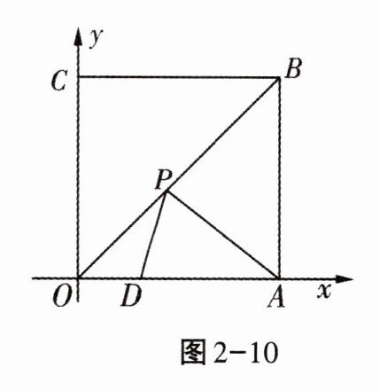 2. 如图2-10,四边形$OABC$为正方形,边长为6,点$A$,$C分别在x$轴、$y$轴的正半轴上,点$D在OA$上,且$D点的坐标为(2,0)$,$P是OB$上的一个动点,$PD + PA$的最小值是( )