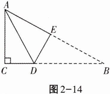 1. 如图2-14,有一张直角三角形纸片,两直角边$AC = 5cm$,$BC = 10cm$,将$\triangle ABC$折叠,使点$B与点A$重合,折痕为$DE$,则$CD$的长为( )