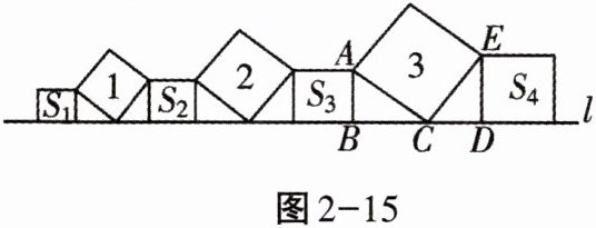 2. 在直线$l$上依次摆放着7个正方形(如图2-15).已知斜放置的3个正方形的面积分别是1,2,3,正放置的4个正方形的面积依次是$S_{1}$,$S_{2}$,$S_{3}$,$S_{4}$,试求$S_{1} + S_{2} + S_{3} + S_{4}$的值.