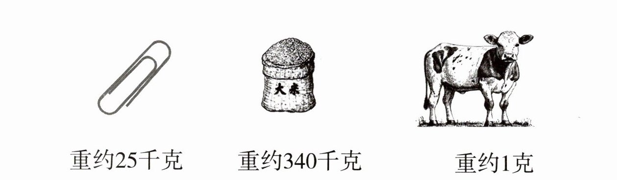 【答案】:回形针——重约1克;一袋大米——重约25千克;牛——重约340千克。