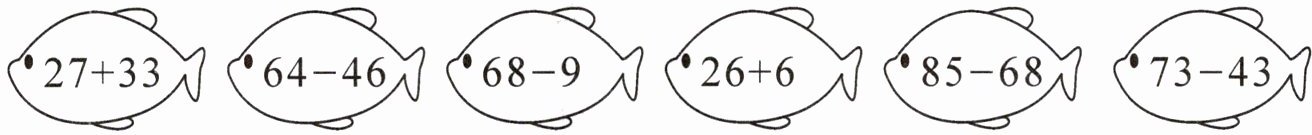 【答案】:涂红色的鱼:$64 - 46$、$26 + 6$、$85 - 68$、$73 - 43$;涂黄色的鱼:$27 + 33$、$68 - 9$