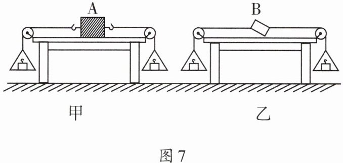 7. 小强和小红利用图7甲所示的装置探究二力平衡的条件。他们实验时发现,当分别往左、右两盘放入质量相等的钩码时,木块A处于静止状态;若再往右盘中增加一个钩码后,木块A仍处于静止状态。经过思考,他们用硬纸板B替换了木块A再进行实验,如图7乙所示。
