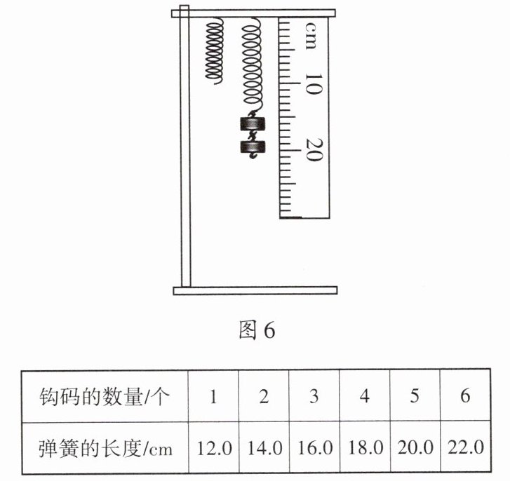 10. 小强准备探究弹簧受到的拉力与弹簧伸长量之间的关系。他把弹簧上端固定在铁架台的横杆上,弹簧的右侧固定一刻度尺,如图6所示。在弹簧下端悬挂不同数量的钩码,观察并记录弹簧的长度,实验数据如下表。每个钩码的质量为50g,g取10N/kg。