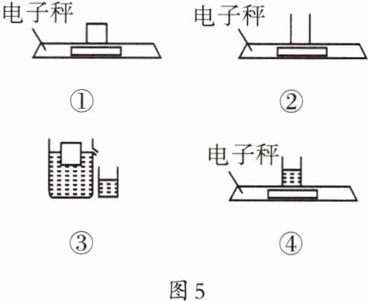 ;又因为$G= mg$,所以只需验证$m_{木}是否等于m_{排}$。于是,小东找来了电子秤(可直接显示物体质量)、溢水杯和小烧杯,并依次完成了以下实验步骤(如图5所示)。①用电子秤测量木块的质量$m_{木}$。