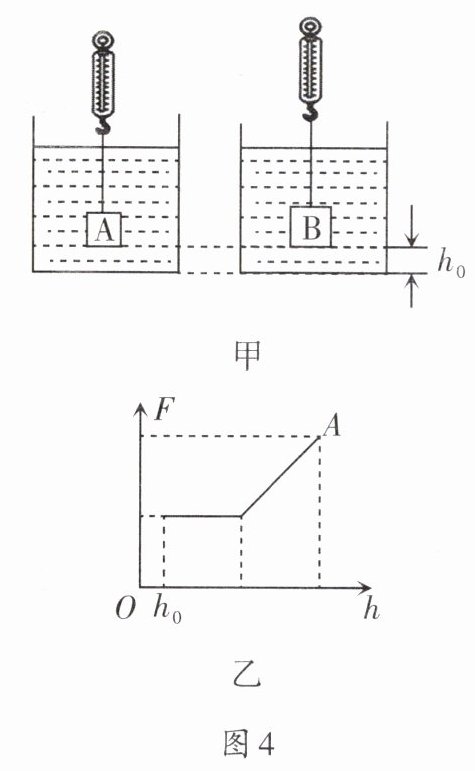 9. 如图4甲所示,将两实心正方体金属块A和B($m_{A}= m_{B}$,$V_{A}<V_{B}$),分别悬挂在弹簧测力计下端,并浸没于装有水的相同烧杯中,静止时下表面距杯底的高度均为$h_{0}$,两杯中水面相平。现将两金属块缓慢从水中竖直向上提起,直到下表面刚好离开水面,悬挂A的测力计示数$F随金属块下表面距杯底高度h$变化关系的大致图像如图4乙所示。请在同一坐标图中画出:悬挂B的测力计示数$F随h$(从$h_{0}$开始)变化关系的大致图像。(忽略金属块离开水面时带出的水,不计阻力)
