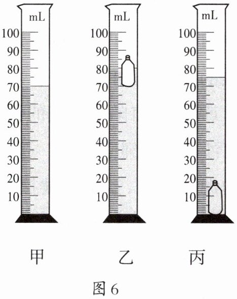 ②如图6乙所示,将空瓶放入水中,空瓶漂浮在水面上,读出量筒的示数$V_{2}= 80mL$。